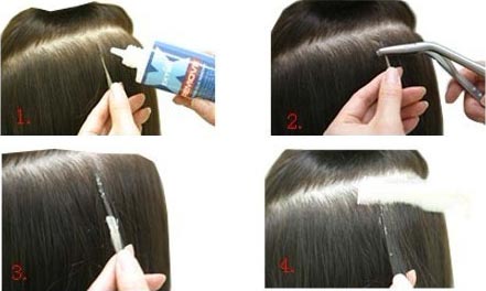 Step 4: Apply the other strips of weft in the same way. Once completed the bonding process allow 20 minutes for the glue to set. Don’t pull extensions when washing and brushing. Ensure top weft will not be visible when all the hair is down.